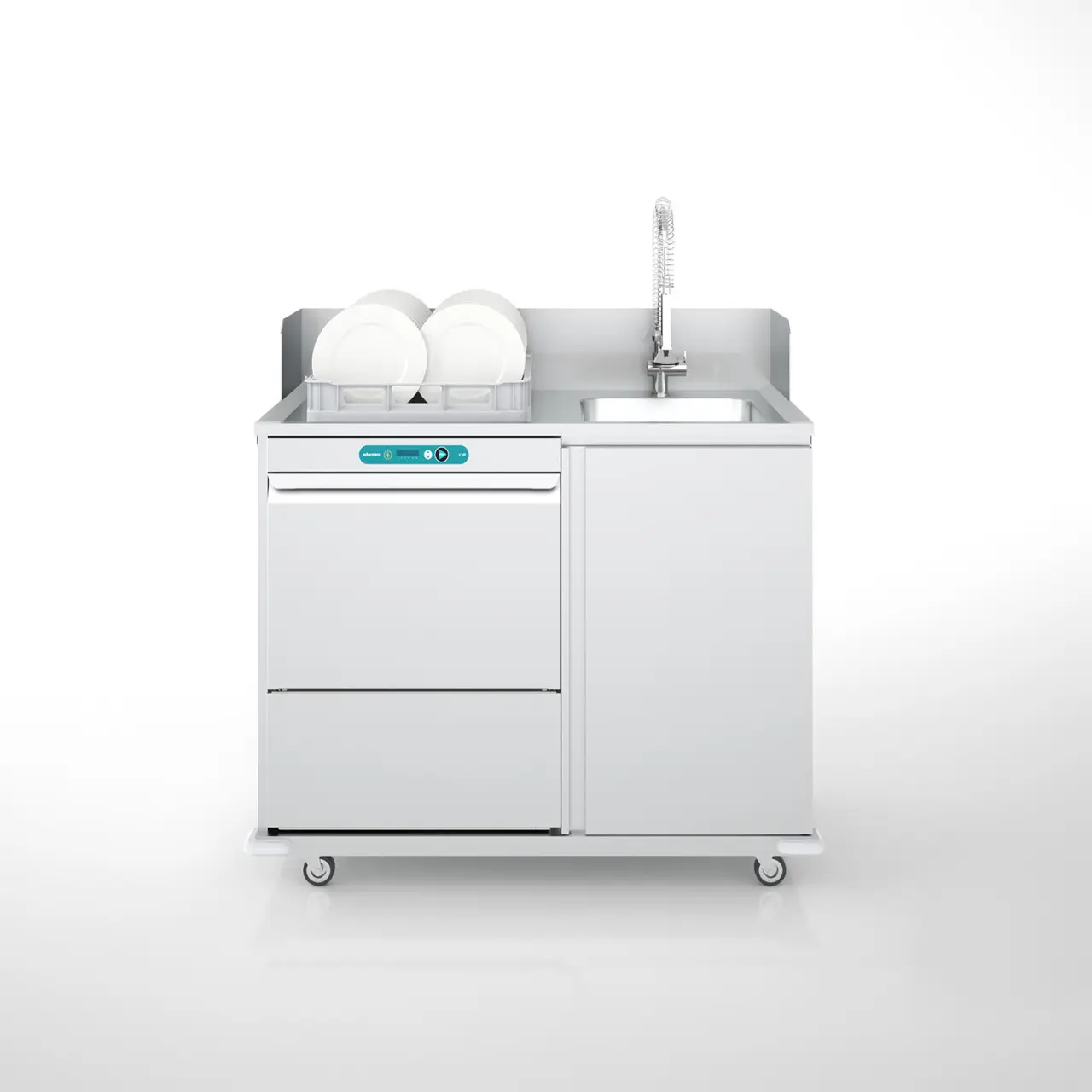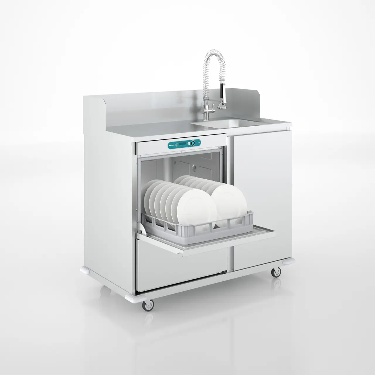 Mobiles Spülen für flexiblen Einsatz Ihrer Geschirrspülmaschine. Verkürzen Sie Ihre Arbeitswege. So ist das Geschirr rasch wieder einsatzbereit.